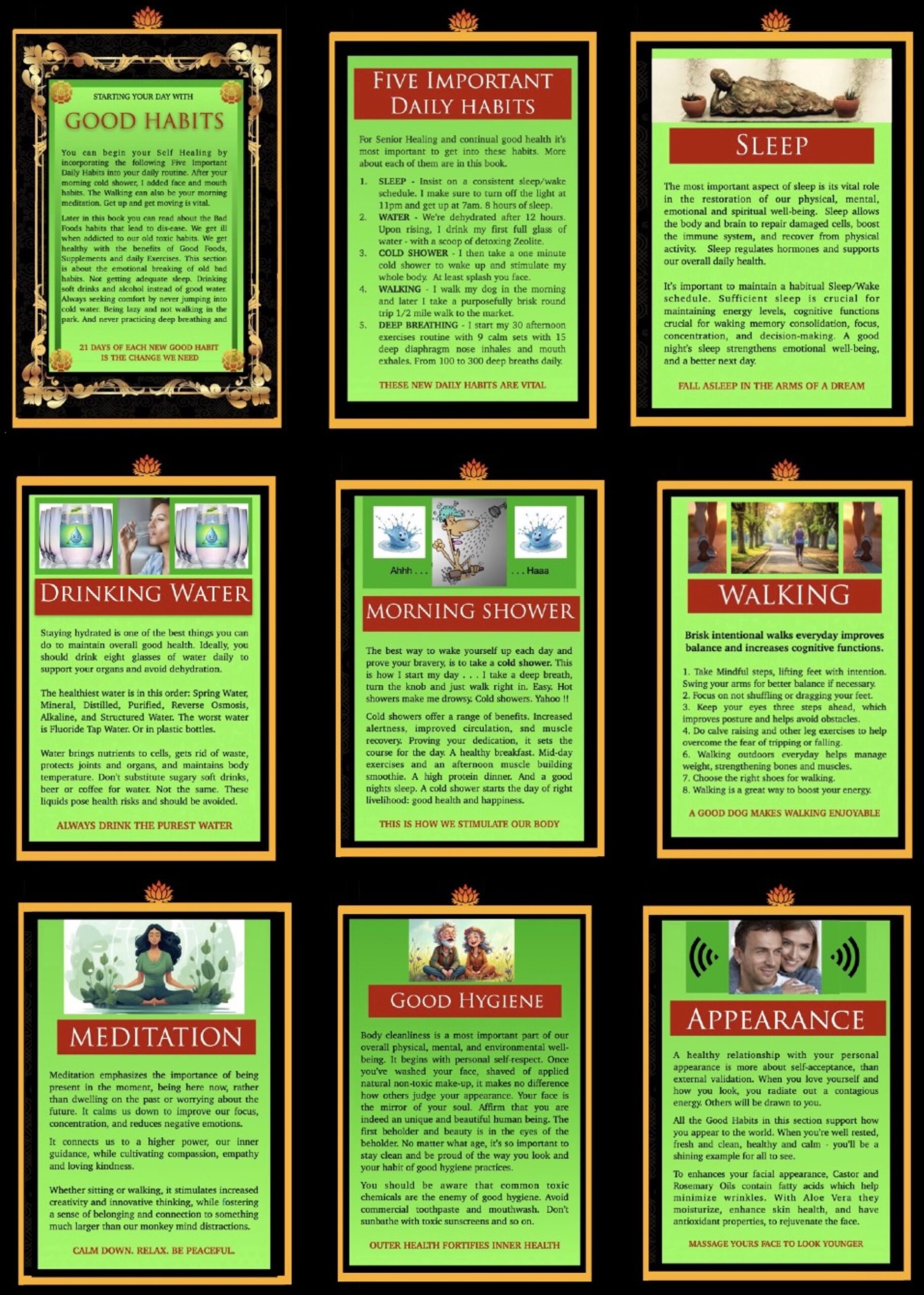 It take 21 days of abstinence to break a habit, and 21 days to establish a new habit. If you begin full stomach breathing, a twice a day exercise routine, long walks and the basic organic whole foods diet for 21 days, without a break, You will want to continue doing it from then on, to further improve your health.